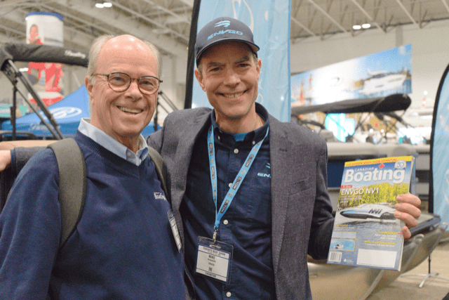 Of course, such a striking and advanced boat deserves to be on the cover. In the photo above, Mike Peasgood holds up a copy of the Canadian Boating January Boat Show issue while he speaks to Andy Adams at the show. During the Toronto Boat Show over 2,000 issues of Canadian Boating with the ENVGO NV1 on the cover were given away to visitors to the Canadian Boating and PORTS Cruising Guide booth. If you missed that, you can read it online at the website, www.canadianboating.ca.