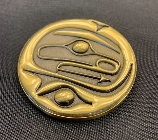 The beautiful award medallion featuring the artwork of Nusi Ian Reid, a member of the Heiltsuk Nation in Bella Bella, is awarded to each recipient.