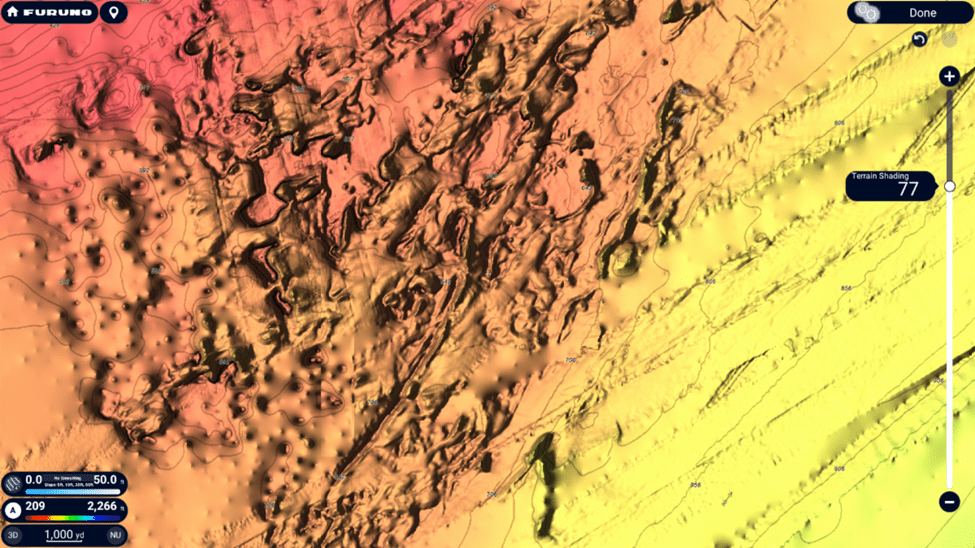 With TZ MAPS, navigators can customize their charts to match the way they fish or cruise. Layers, including satellite photos, contour lines, and 3D bathymetric views, can be combined and fine-tuned to suit any condition or activity. Powerful features like BathyVision™ bring the seafloor to life with contours down to 3-inch resolution and vivid shading that reveals ridges, drop-offs, canyons, and structure in stunning clarity, giving captains a true-to-life sense of underwater terrain.