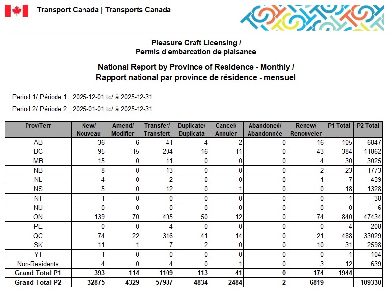 The following charts gives the Canadian pleasure craft licensing statistics for the month of December 2025.